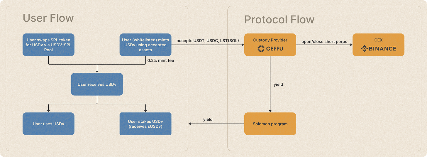 USDv — $1 stablecoin held near its peg by two‑way arbitrage. Typical entry/exit is via stablecoin pools on Solana. Approved market makers and compliant parties can mint/burn.