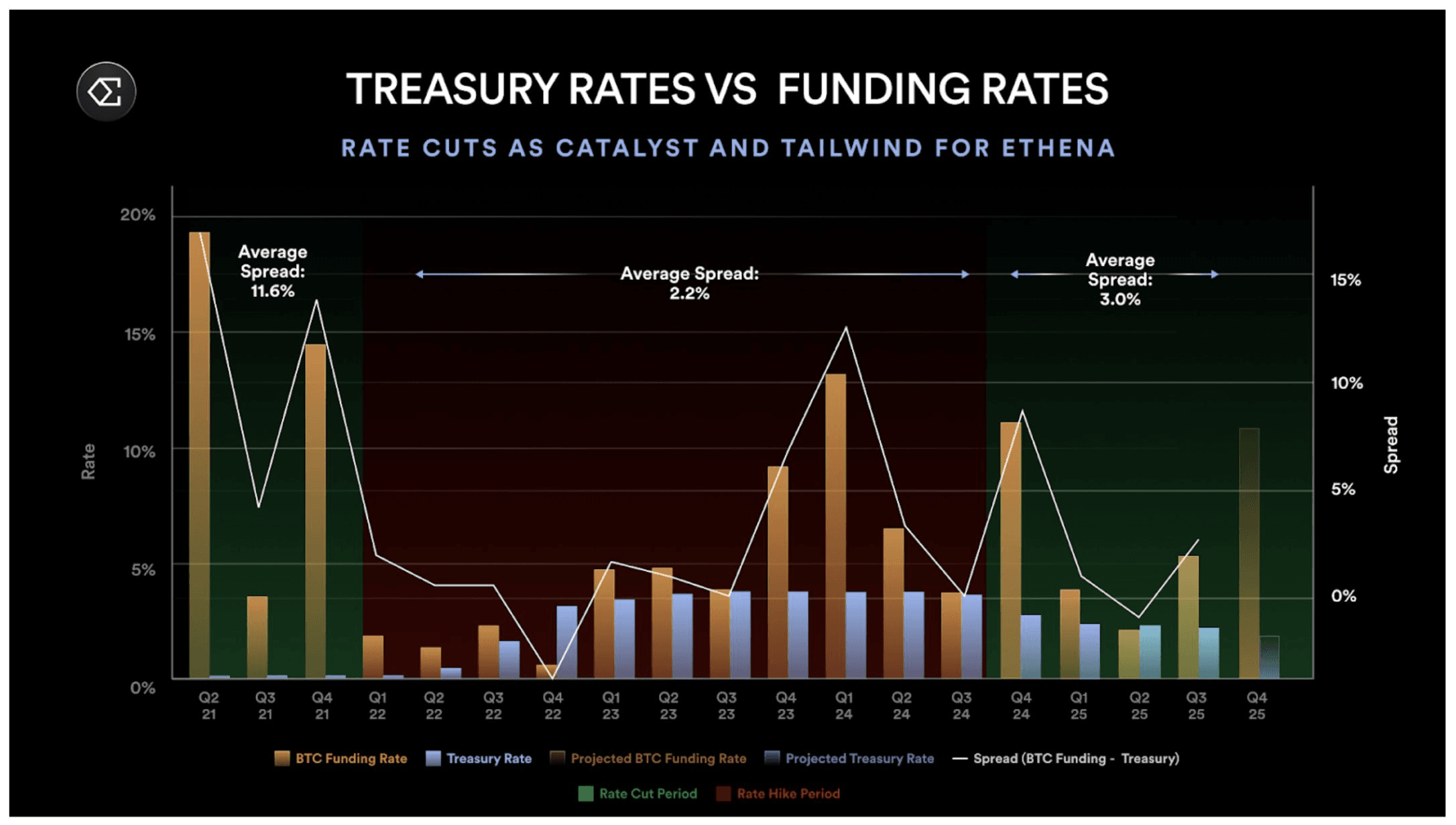 As highlighted by Multicoin Capital on their Ethena thesis here, there is a pickup in spread between interest rates and funding rates in a declining interest rate environment - i.e. as one of source of yield dries up, funding help make up the lost yield in a bull market.
