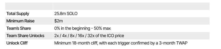 On the tokenomics side, 50% of the max SOLO (Solomon’s token) is potentially reserved for the team - this allocation is more incentive oriented i.e. chunks of the allocation unlock as the price goes up from the initial ICO price.